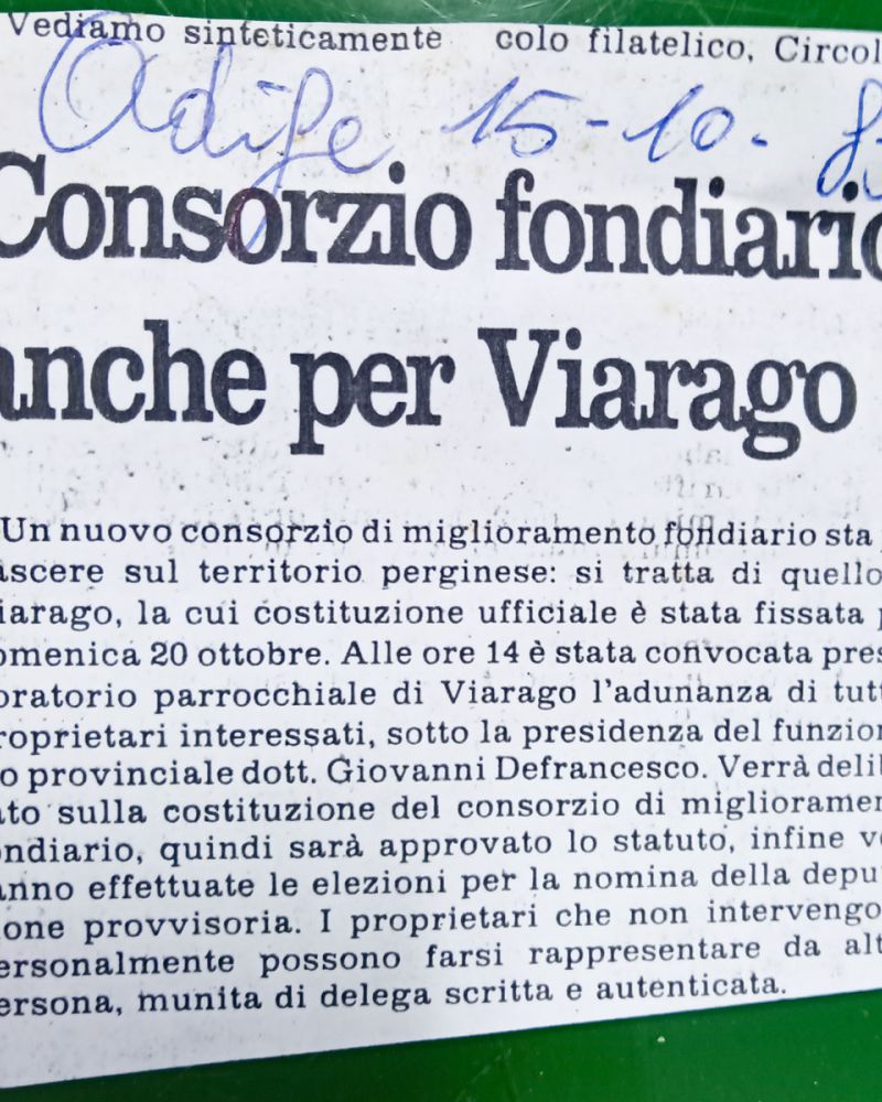 Il Consorzio di Miglioramento fondiario di Viarago, è stato fondato nel 1985, più precisamente domenica 20 ottobre di quest’anno, il Commissario nominato dott. Giovanni Defrancesco, ha convocato l’assemblea di formazione del Consorzio. Si precisa, che la spinta nell’istituzione di questo ente è nata da un comitato promotore istituito nel 1984, costituito da Guido Valcanover, Ermon Mario, Fontanari Paolo, Pintarelli Remigio, Zampedri Luciano, Casagrande Giovanni, Zampedri Lorenzo e Valcanover Guido.
