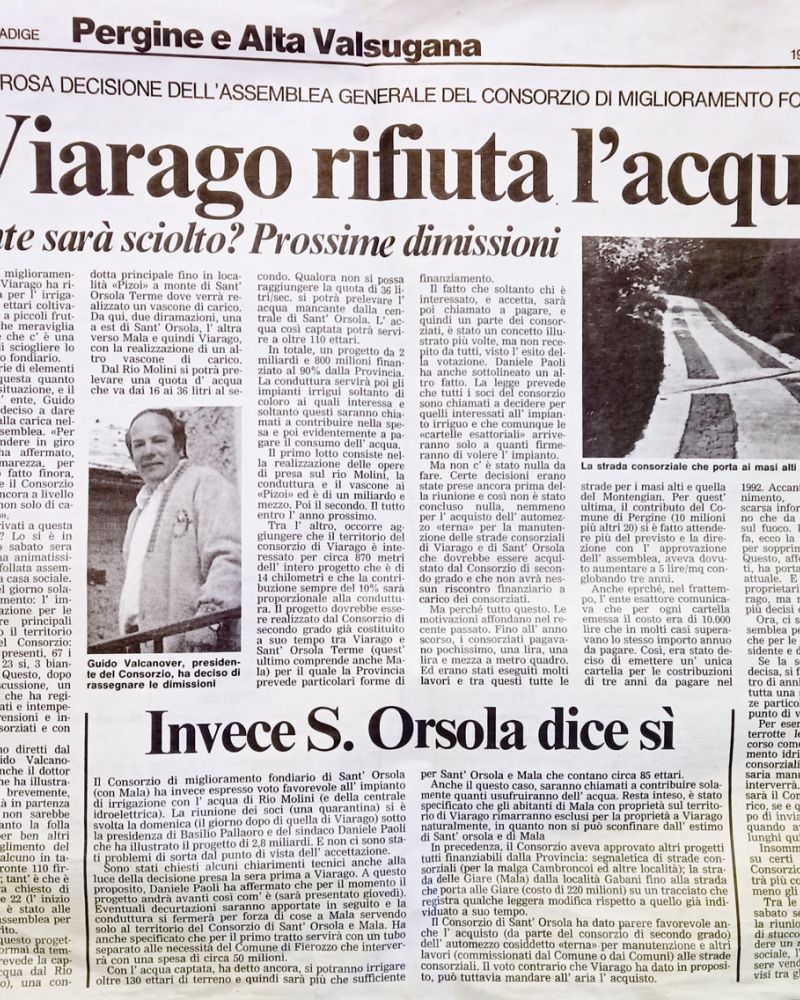 Purtroppo, non sempre il Consorzio di miglioramento fondiario di Viarago è stato considerato un ente di valore ed alla base dello sviluppo agricolo del territorio. Infatti, il cambio di direttivo nel 1993 è arrivato al termine di una veemente contestazione da parte di alcuni soci, che hanno posto in assemblea generale il rifiuto all’acqua per l’irrigazione, richiedendo addirittura lo scioglimento dell’ente nato da pochi anni ed ormai già operativo sul territorio. Le discussioni, hanno portato a tanto lavoro ed alle dimissioni dell’allora presidente, ma, grazie all’operato del consiglio dei delegati non alla soppressione del Consorzio e, non all’abbandono del progetto di irrigazione dei fondi nel C.C. di Viarago. Si rimanda comunque alla sezione “dicono di noi” presente all’interno del sito, per la lettura degli articoli delle allora testate giornalistiche interessate agli eventi.