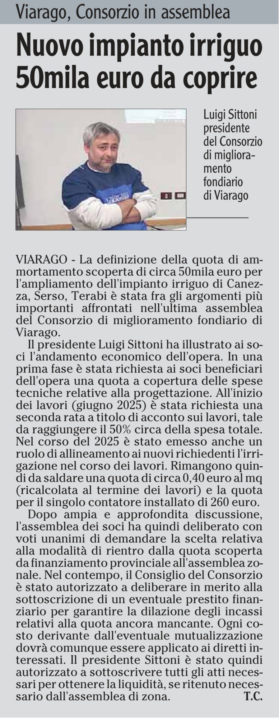 Il Presidente Luigi Sittoni ha illustrato l'andamento economico dell'opera di ampiamento dell'impianto irriguo.