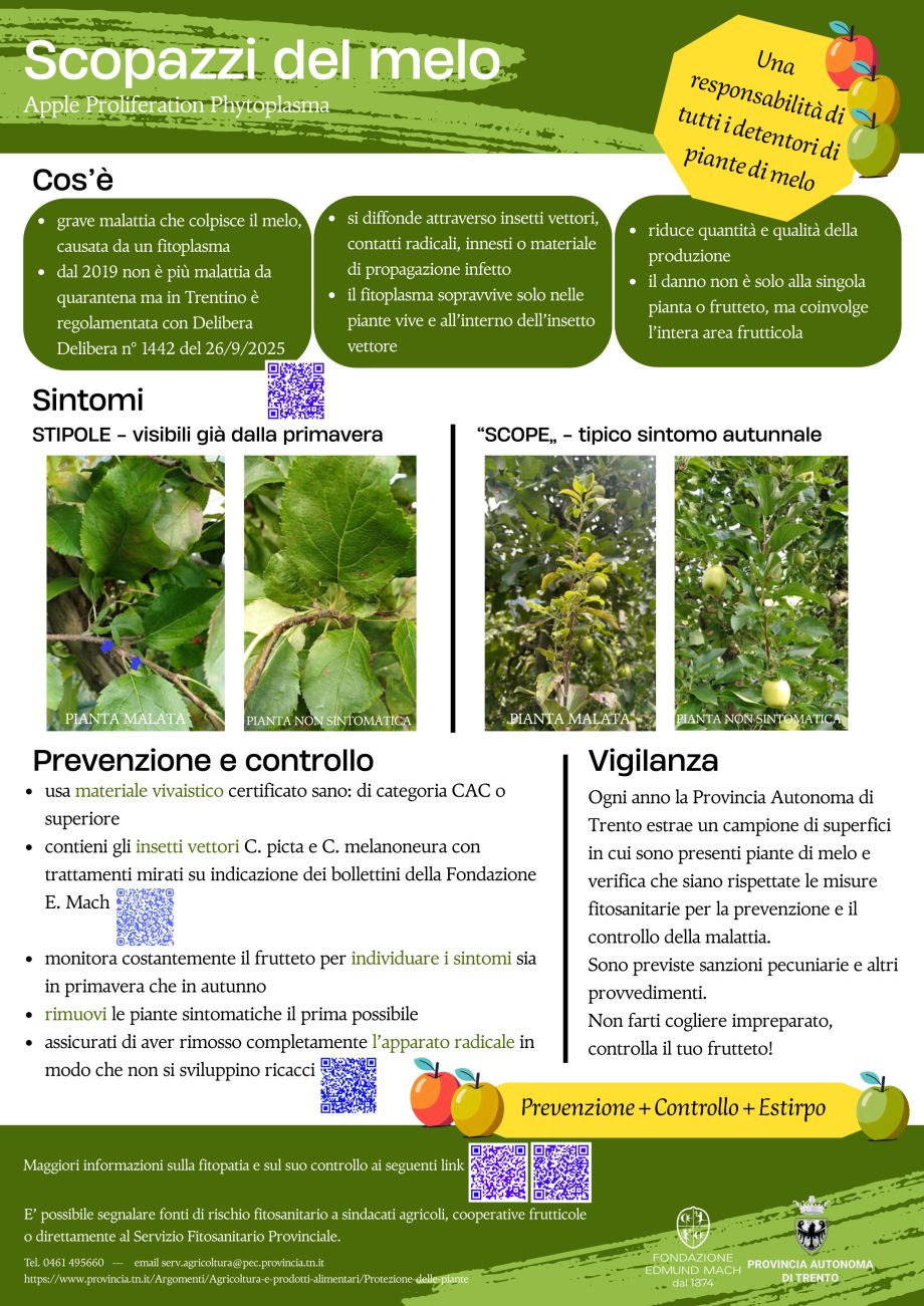 Con la Delibera di Giunta n. 1442/2025, la Provincia autonoma di Trento ha aggiornato il Piano di azione per il contrasto agli scopazzi del melo, malattia causata dal Candidatus Phytoplasma mali, che minaccia i meleti trentini.