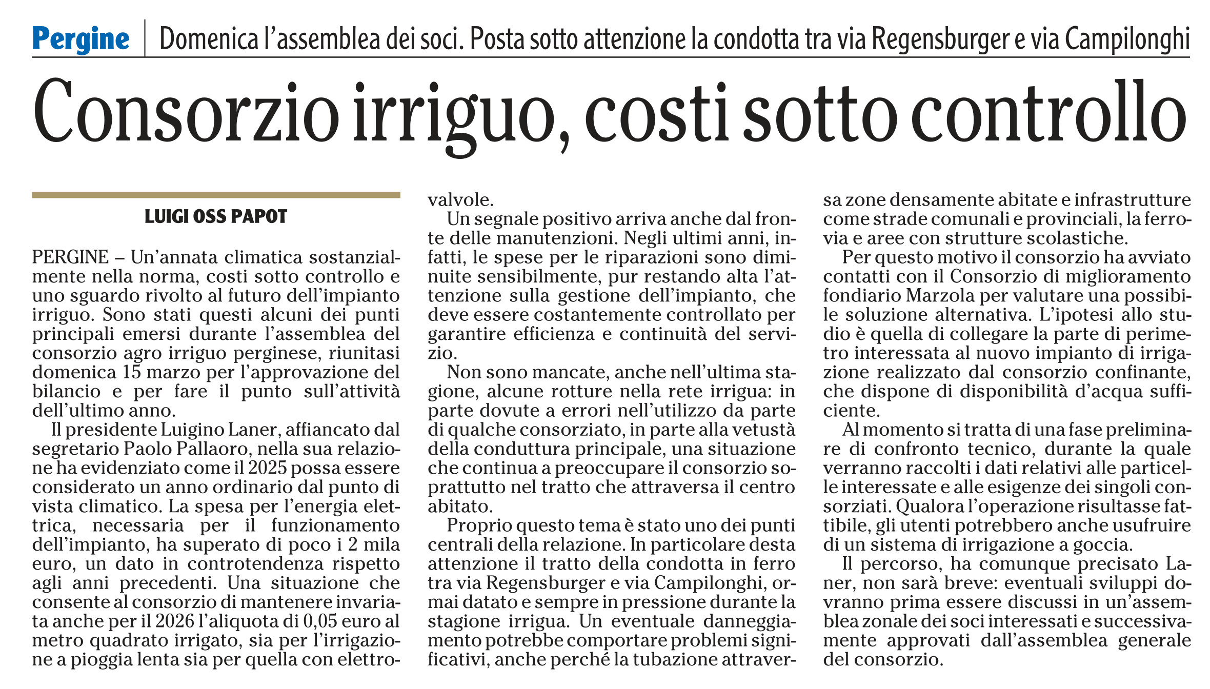 Dalla stampa: "Consorzio Irriguo Agro Perginese, costi sotto controllo".